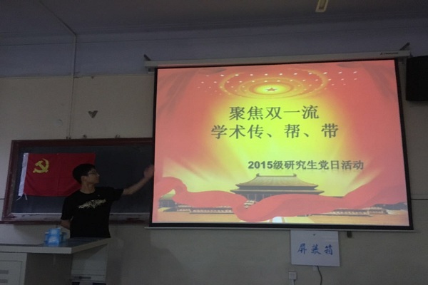 6月6日晚18:30,航建学院2015级硕士1-5班党支部在11号楼0135教室举行“聚焦双一流、学术传、帮、带”主题党日活动,活动现场张挂党旗,所有到场党员佩戴党徽。本次党日活动旨在号召学生党员时刻保持思想的先进性,在专业学习方面切实做到“带头加油学”。