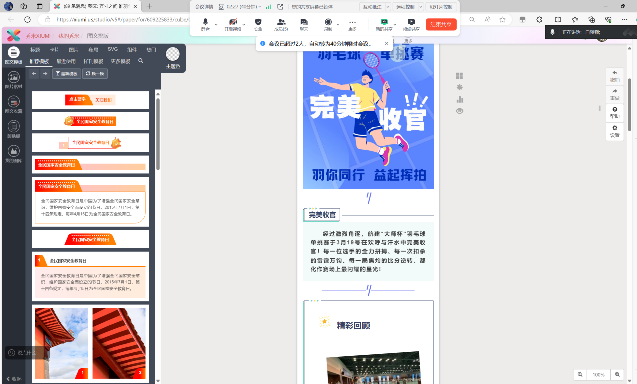 在模板知识推送方面,主讲人详细介绍了如何利用现有的模板资源高效制作高质量的内容,并结合实际案例讲解了模板选择与定制的技巧。这不仅提高了内容生产的速度,还确保了信息传递的一致性和专业性。视觉设计部分则着重讲解了色彩搭配、排版布局以及图片处理的基本原则。通过实例分析,学员们学会了如何运用设计软件制作吸引人的图文内容,使信息更加直观易懂。此外,网络宣传设计环节深入探讨了如何根据目标受众的特点制定有效的宣传策略,以最大化传播效果。