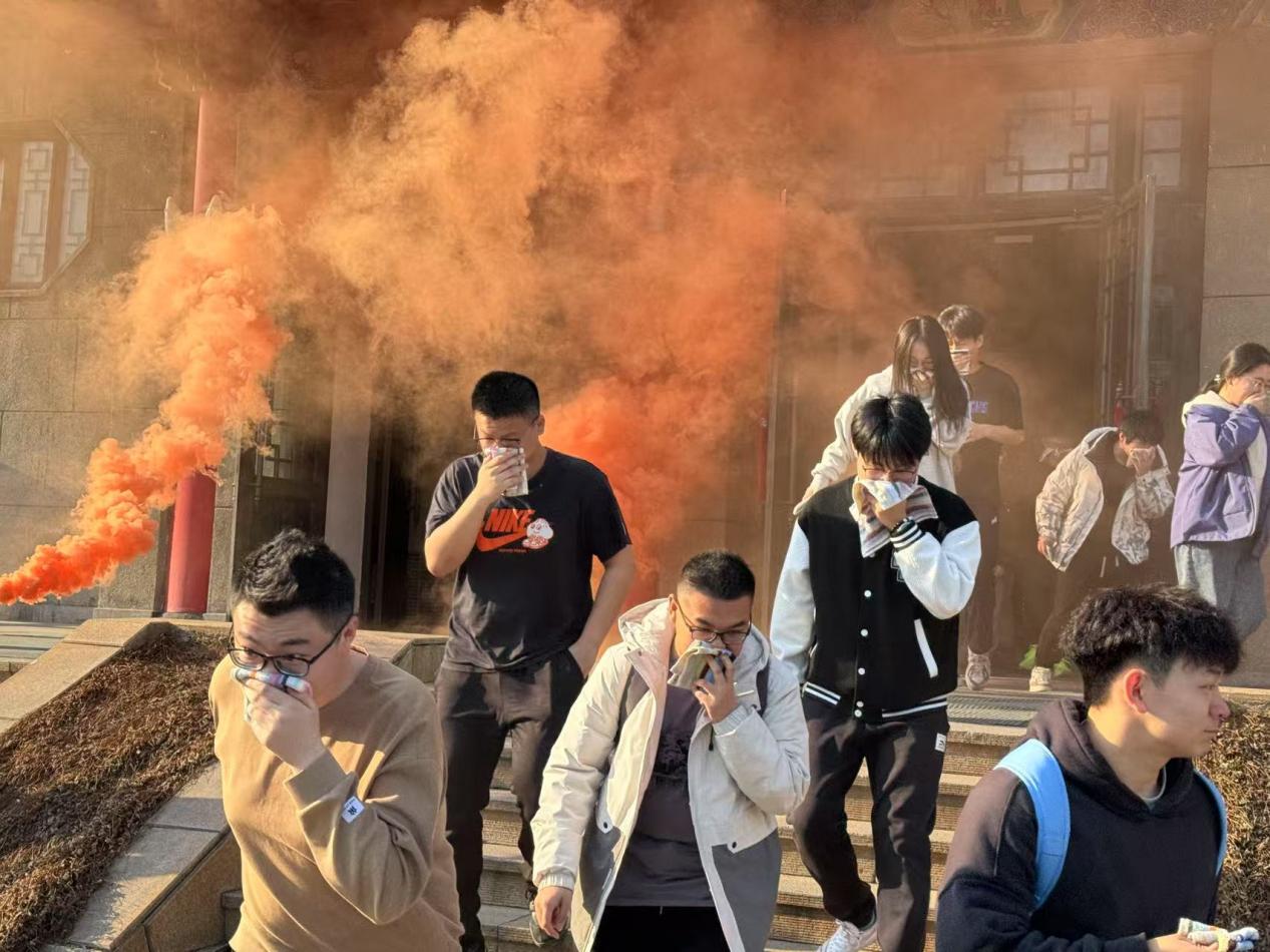 随后进入实战演练环节,警报声响起后,消防疏散员迅速到位,模拟浓烟环境下,引导师生用湿毛巾捂住口鼻,沿安全通道低姿弯腰、单列靠右有序撤离到指定区域。